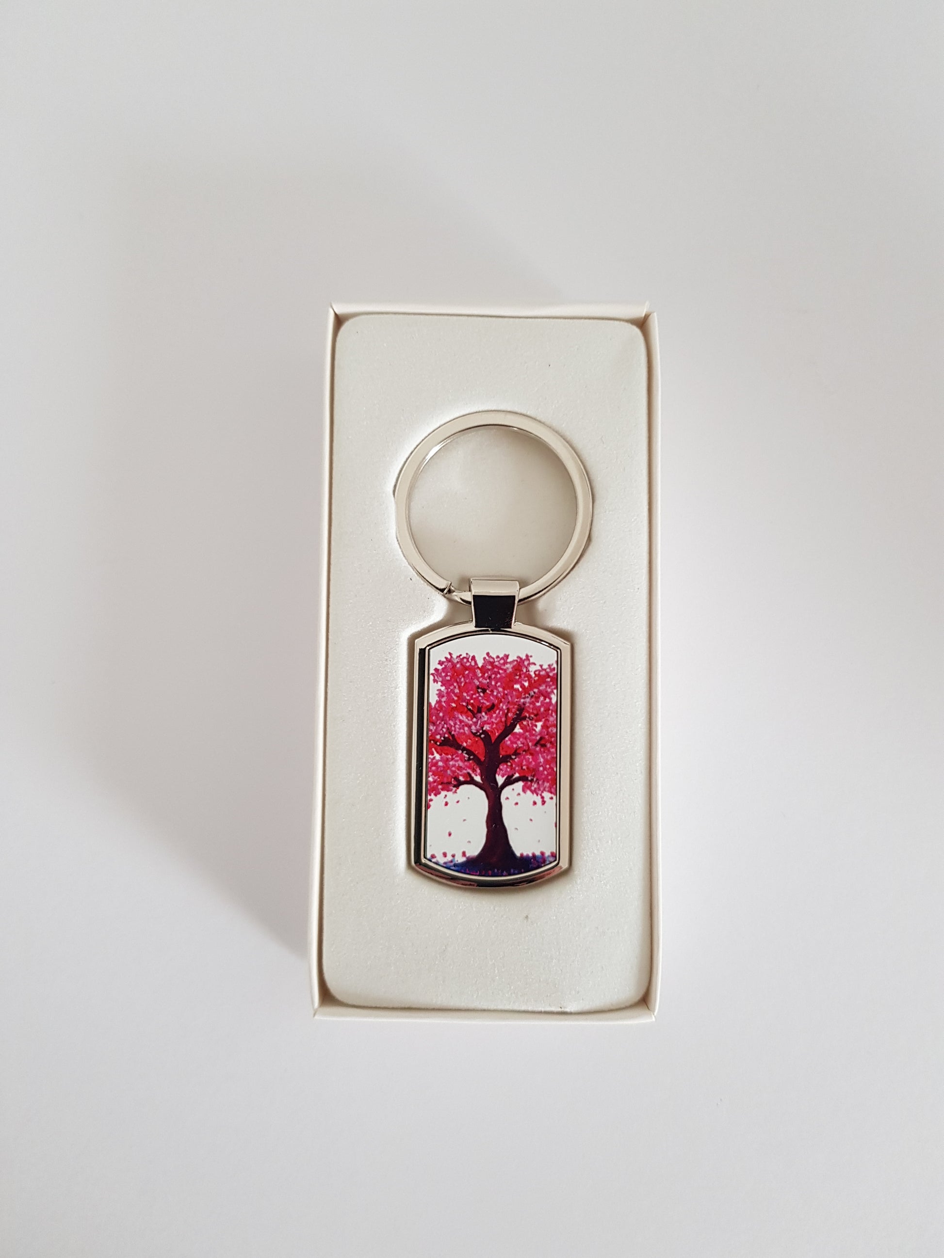 'Cherry Blossom Keyring' Taken from my original painting. Carry the beauty of Cherry Blossom wherever you go with this exquisite keyring featuring a stunning reproduction of my original art. The vibrant colours and intricate details capture the essence of the flowers, making it a perfect keepsake or gift.