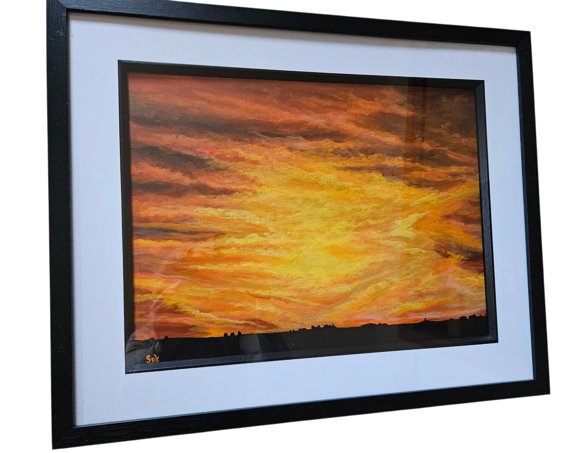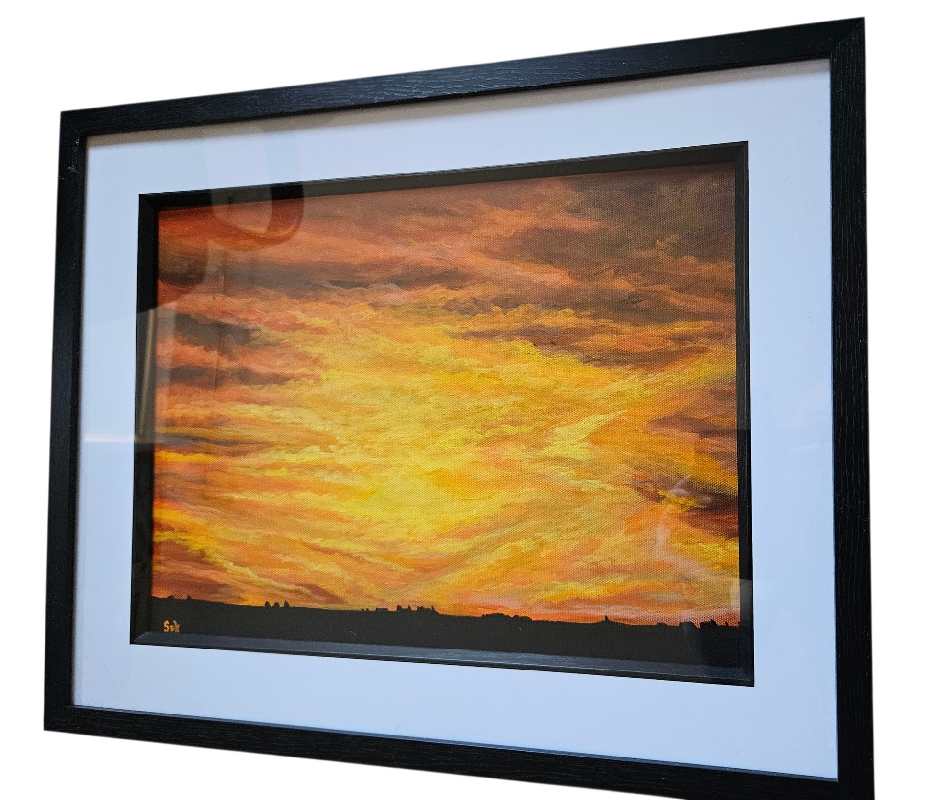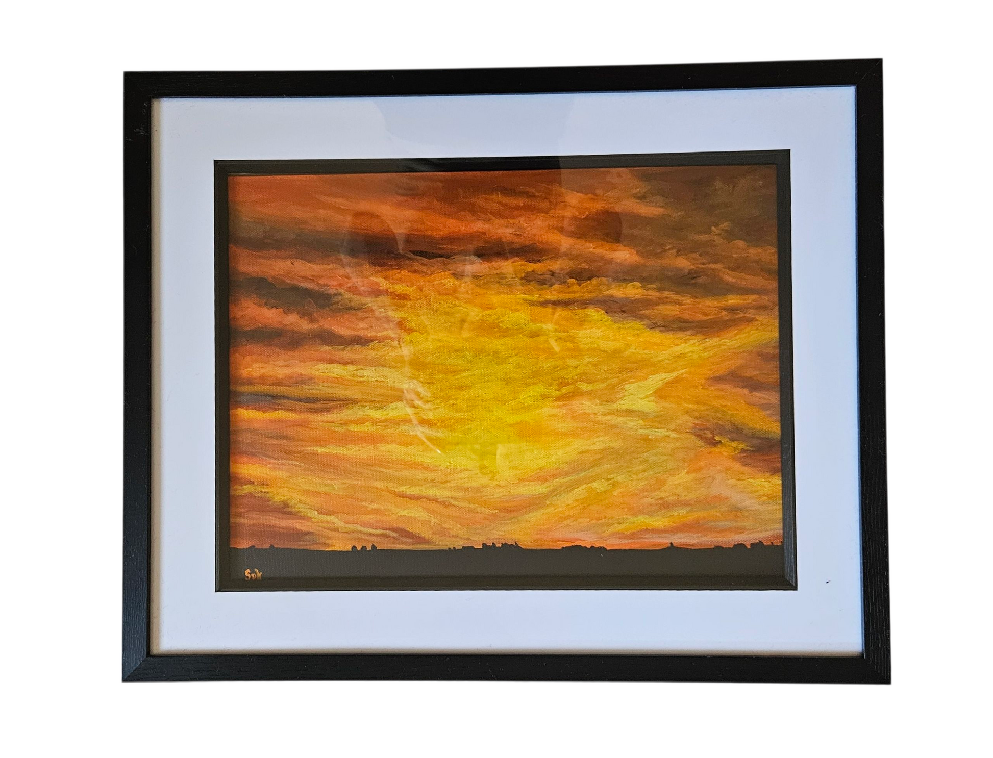 Embers Glow is a one-of-a-kind acrylic painting capturing the radiant warmth and dramatic beauty of a fiery sunset. Layers of rich oranges, deep ambers, and soft golds blend seamlessly across the sky, creating a powerful sense of movement and light—like the final glowing embers of a day fading into night.