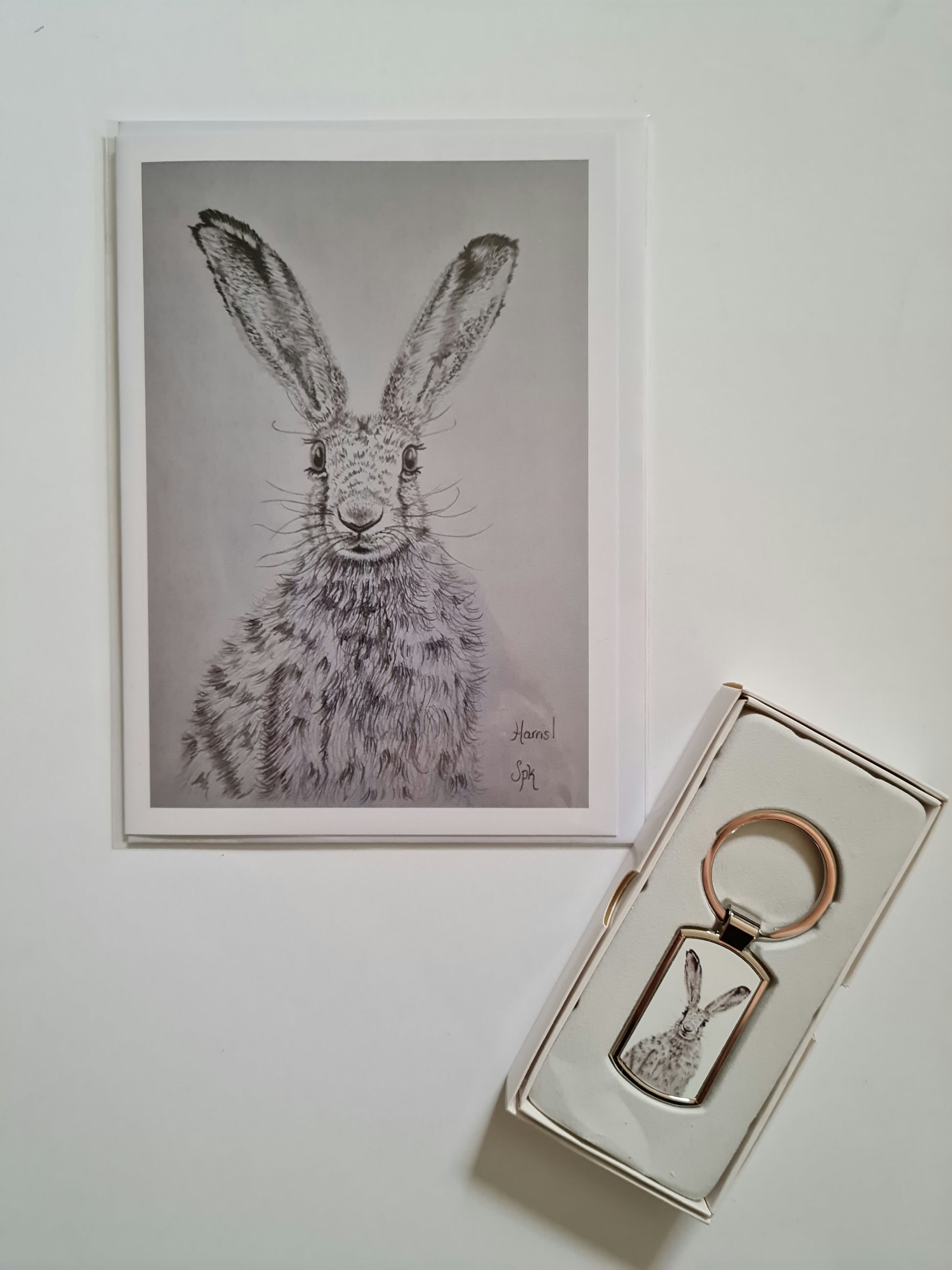 'Hare Keyring and Card Set' Taken from my original painting. Carry the beauty of this Hare drawing wherever you go with this exquisite keyring featuring a stunning reproduction of my original art. This set also includes my Hare card, printed on 7x5cm premium cardstock, with white envelope. The vibrant colours and intricate details capture the essence of the flowers, making it a perfect keepsake or gift.